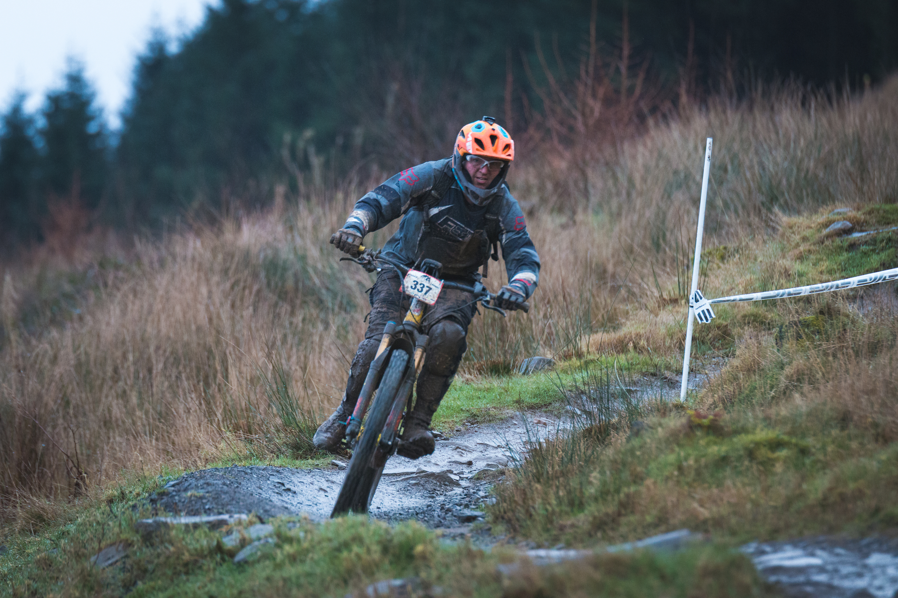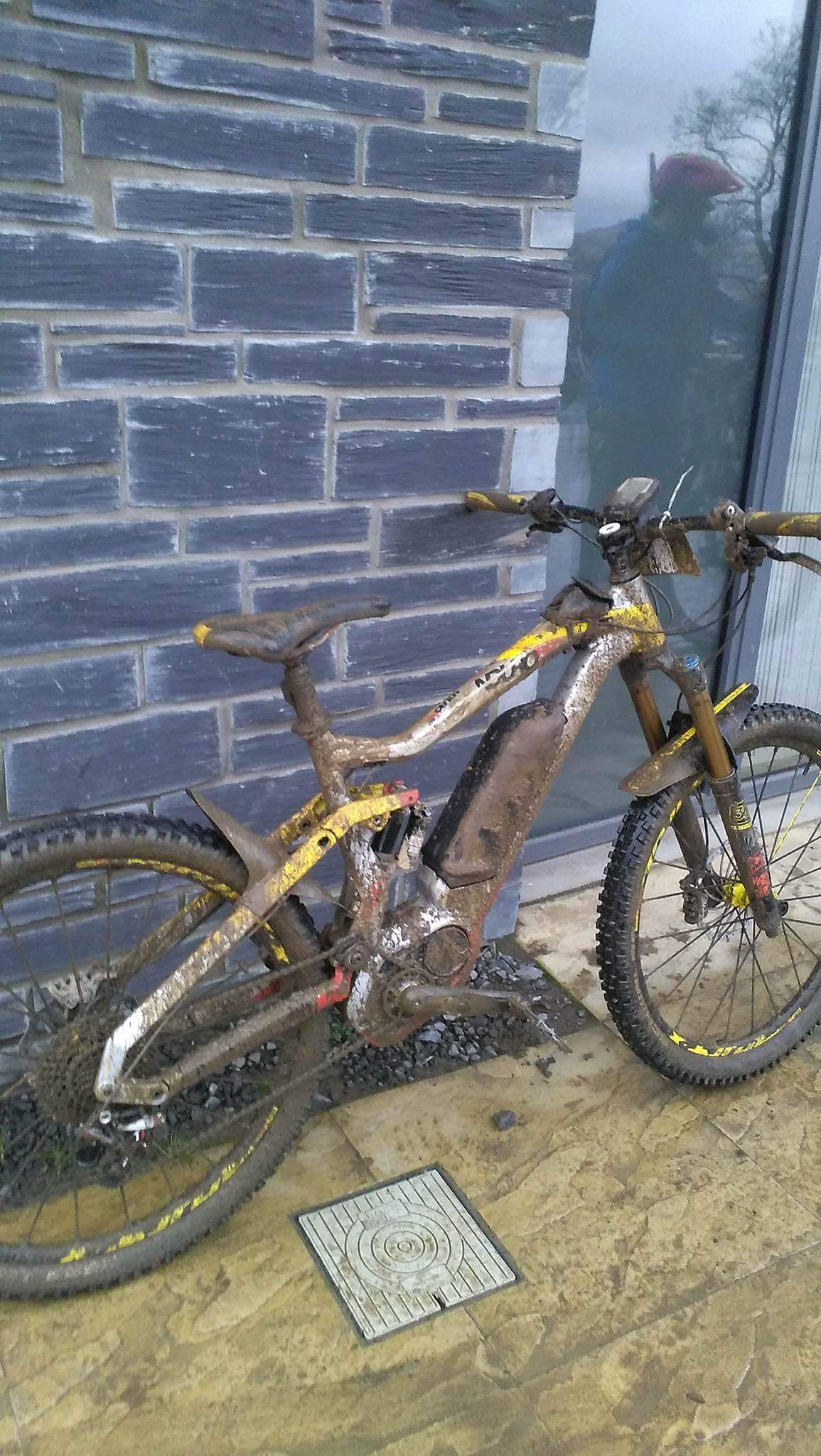 Well, I survived but true to form I lobbed the bike on the second stage... Got there at about half nine and had to park almost by the roundabout as it was so full. Got togged up and it started to drizzle a little. Met up with a few others, mostly on e-bikes, and pushed the ones without a motor up the hill. Did the second stage first as it was at the top, not realising that it was also the black run... Set off down it without any drama but a few of the drop offs were (to me) quite knarly and high. Due to the sleet and mud, my MX goggles were not performing so half way down had to stop and take them off as I couldn't see where I was going, then I got mud in my eye so did half the run with one eye closed... I then did the e-bike stage (easy really, just uphill single track stuff), and the second stage. We stopped half way down and another e-bike came past us, pretty rapidly to boot - he was shredding the corners and was fast. Gulp. The competition had obviously upped it's game this year... By now it was lunchtime and the race was due to start at 1pm. Into the cafe and after purchasing some clear glasses, a burger, hot chocolate, nachos and chocolate cake ensured that I was fully race fit and mentally prepared...not. Last time I had been on the bike was 3 months ago at the beginning of the year (work commitments precluded any time on it). I just wasn't feeling it, maybe the film (Logan) at midnight beforehand didn't mix with the early start...Anyway, it was now start of the race and sleeting...deep joy. I could just go to sleep in the warm cafe, especially as the e-bike category was the last one and we were due to line up at stage 1 at 15:45. :rolleyes: Of we set at half past, sleet now stopped but it made the course very gloopy. Did the first stage and I believe I was in 5th place out of a respectable 19 that were racing - I had caught the rider in front but red mist got the better of me again and I started messing corners up by diving in too fast and running wide into the scrub instead of staying on the (faster) track. The second stage was next, and I set off well, getting through the tricky stuff without too much hassle but as I came out of the forest and onto the very muddy section I was carrying far, far too much speed (for my ability anyway) and you know when you're beyond that point of no return and it all starts going Pete Tong...I was there and it was only a matter of time before it all turned to snot. One foot had come off, another drop off later and both feet were off, sat on the saddle being a victim of circumstance, the next dip nose dived me over the bars and I slid gracefully face first down the track. Everything was now covered in sticky mud, and after picking myself and the bike back up, I carried on - only to fall off immediately after getting back on...oh the shame of it. The wind was now knocked out of my sails though as I rolled everything to the finish line, what didn't help was the mud - my hands just kept slipping off the handlebars and I couldn't grip the bike properly. I cleaned up in a stream and with now clean but wet hands, I set off for the third stage. I had not practiced this section but others had said that it was arm pump city. The rider in front set off, the beeps indicated my turn and off I set. Nice single track all the way down, and again I caught the rider in front - he pulled over to let me past, but at the end saw that he only had about 120mm of suspension...the benefits of 180mm travel came into its own on that stage with just letting the brakes off and rolling it. Back at the car, tired, elated and very, very muddy.... Next one is end of April it FoD, I recommend everyone have a go at a round at least once, they really are good fun. See you all at the start line for that one then...:):) Some photos below, note my "oh sh1t, lift you bu88er.." face as I heave on the handlebars...that was the time in practice where I land on the up of the next jump, and feeling like I snapped the bike in half...video to follow shortly. Bike performed flawlessly and stood up to the abuse again. Can't fault my Haibike and really enjoying throwing it about. In the end, I finished 11th as the crash on the second stage cost me, plus the up hill section drained me and my legs were like lead half way up, despite being on turbo mode...2 x batteries used throughout the day, each were down to one bar.