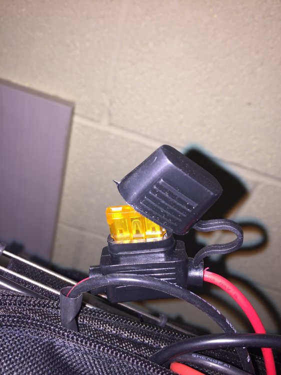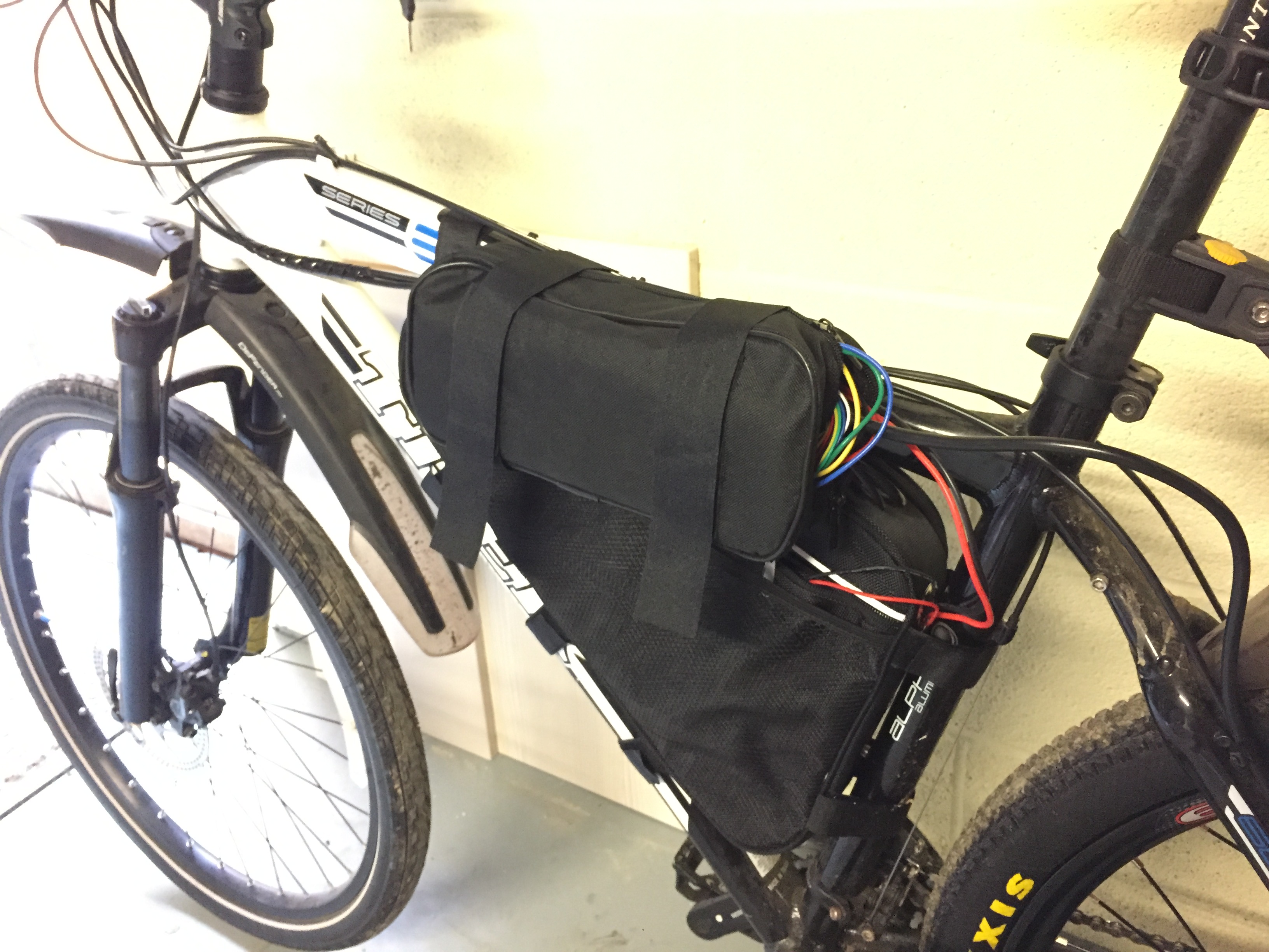 No I'm not using the frame for an earth, I meant if any exposed wires were coming into contact with the frame would that would be the cause of sparking. This is the fuse and holder, does look to be an automotive type. 40amp fuse. This is the controller bag which I've tried to keep the majority of the wiring in, although it is pretty tight for space in there. This wasn't yet fitted in my original picture of the bike.