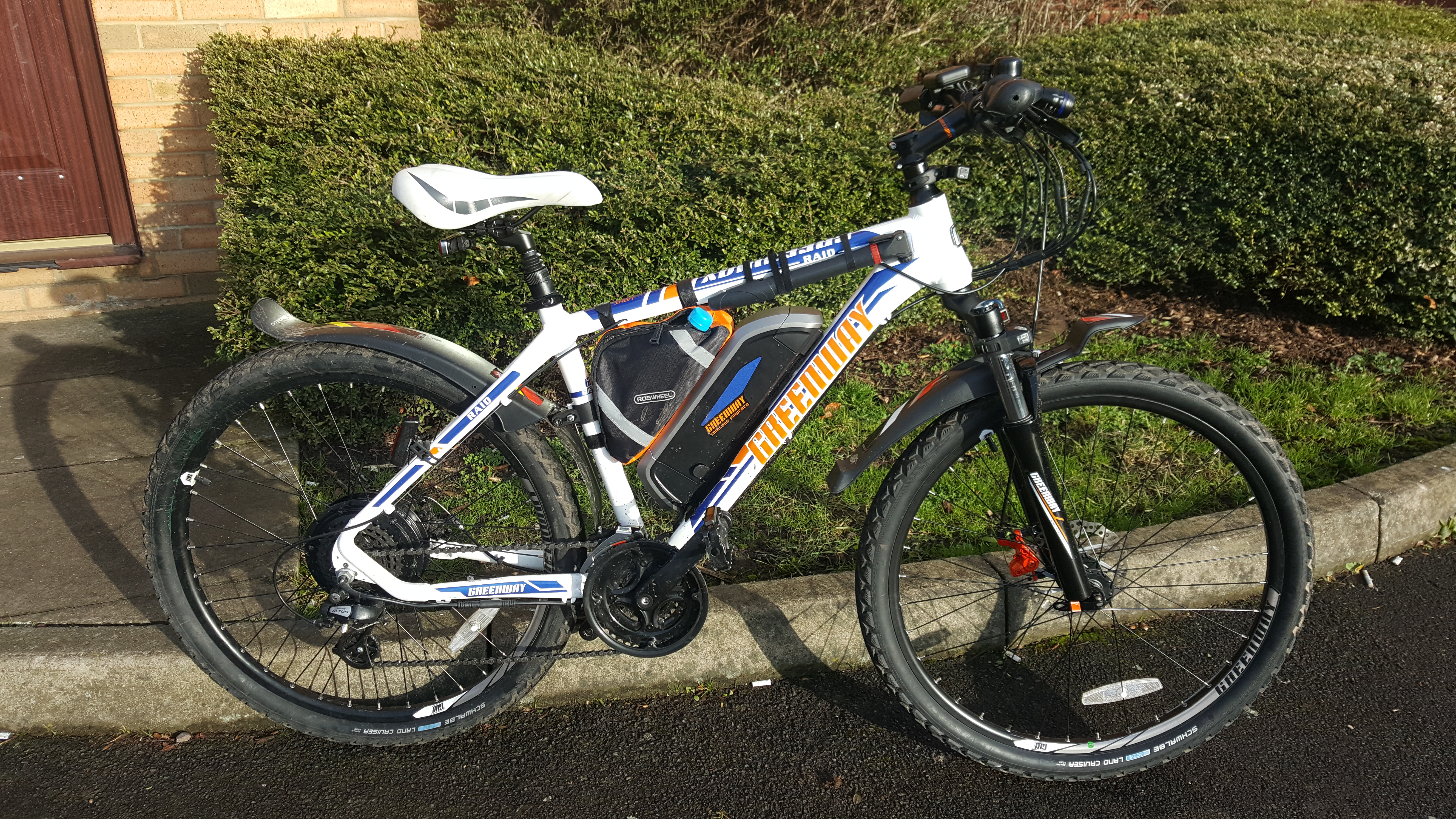 Hi all, got myself a new ebike sept 2016, used it most days since and really have been bitten by the bug, I am a keen 58yr old petrol head but I have lost my license until July this year and I simply had to stay mobile hence the reason the purchase of an ebike. I had been lurking on here for months looking for advise on the best styles etc, I would have loved to have been in a financial position to buy a lovely premium brand but had to settle for a new Chinese make, after looking at all makes, costs and what was the best deal, I settled for a Greenway e-MTB, 36v 10.4ah Samsung cells 350w 8fun hub 24s shimano JLCD Kingmeter display F&R discs Front suspension £639 Mods so far, Land cruiser tyres Slimed tubes Gel seat Suspension seat posts Good safe lightning. Today I did a 25mile commute to work, really no effort at all Barr a bloody puncture in the rear, green goo everywhere. Good job I took a pump, spare tube, 18mm spanner and two spoons, just incase. Comments and questions gladly received as it appears a great community. Phil - when to change disk brake pads?