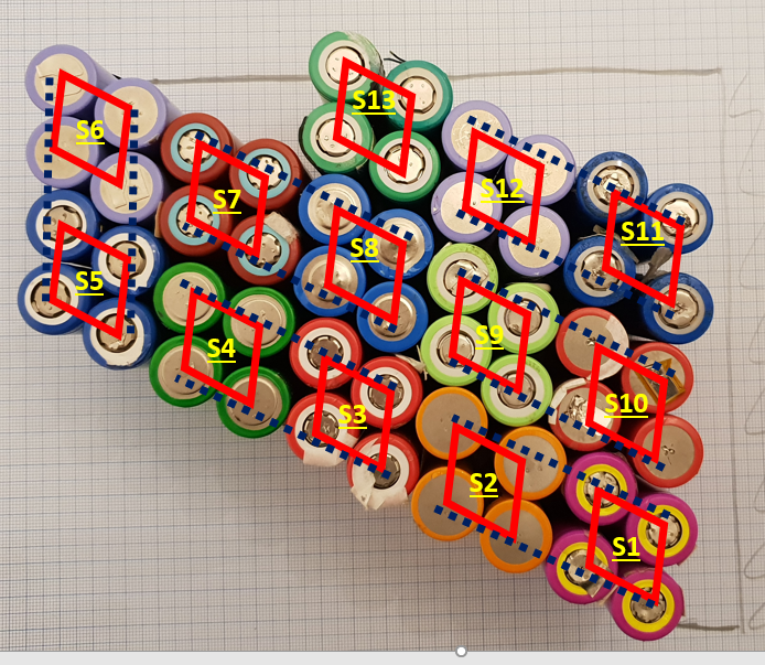 I have got a tight space to fit a 13S4P into and have been messing around with layouts for a while and i think this is my best option. I have two thoughts on connecting S11 to S12, one is to put an extra thick layer of insulation over the ends of the cells in S10 and S9 so i can lay nickle strip between S11a and S12a etc - or to use a decent gauge wire which is already insulated and solder that to a piece of nickel, and then spot weld the nickel to the battery? The batteries in the picture are for illustration only