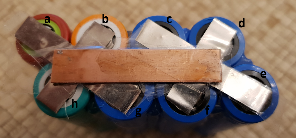 I have done a quick mock up and looking at the layout the nickel strips will be a different length - is that bad thing?; a to g and c to e = 45mm b to h and d to f = 30mm If so as another option could i not use a bit of nickel sheet/foil that would cover the whole of the eight batteries in each S, like what KirstinS shows in her post (https://www.pedelecs.co.uk/forum/threads/hear-shrink-large-for-whole-packs.33604/) the holes/gaps look like they are just to align the nickel but it covers all 8 ends.
