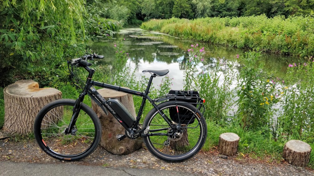 I recently completed my second Woosh kit conversion, on my wife's elderly but well-maintained Claud Butler Valetta. I went with the front wheel conversion and rear rack on her bike for simplicity, weight balance and to allow a larger battery pack than would have likely fitted within the triangle of her smaller bike frame. This was a really easy installation, I was fortunate to be able to use the integrated left side pedal sensor from Woosh, which makes for a fabulously neat installation, whilst the rear rack can accommodate a rear bag we acquired with a recent second hand folding bike acquisition, which is where this whole idea started. She had really got back into cycling using the folding bikes and the ability to travel somewhere for a ride via car or train, but then wanted the ability to ride in the hillier areas near to where we live. With the great success of my own XF08 conversion, another Woosh kit was a no-brainer. The bike has in her words been a revelation, the hills and climbs no longer pose a threat and we've been gradually increasing our ride distances together, culminating in her first 100km ride last weekend. Like me, she is mostly riding with minimal assistance, which means we get insane mileage from the large battery packs we have (20Ah on hers). I've done two weekends now with >100miles of riding from a single charge and still a full charge indicator (dropping one bar on a heavy climb). It's reassuring to know there's reserve when required but that in all likelihood the battery pack will last longer owing to the fewer charge cycles we'll need. I did have reservations about the lack of disk brakes and another reason for a front wheel conversion was to re-use my bike's rear disk wheel and upgrade to disks, but with a decent set of fresh pads we've had no issues at all, so haven't bothered to look at that yet. I've done some other comfort upgrades for her, similar to my bike, so handlebars with some rise and sweep, new grips and a new saddle. The only issue I'd overlooked prior to this build was her saddle height, relative the the rear rack position and height, but an appropriate riding position has been achieved, with just a slight downward tilt on the rear rack. We even cycled from our home in Kent into London recently and home, something I'd never have considered doing previously. Our rides are always accompanied by a flask of tea and a picnic and it's been such a wonderful experience to be able to cycle together with neither holding the other back. The weight loss I've achieved is an equally strong motivator too, currently I've lost around 27kg, even with the occasional cake on route