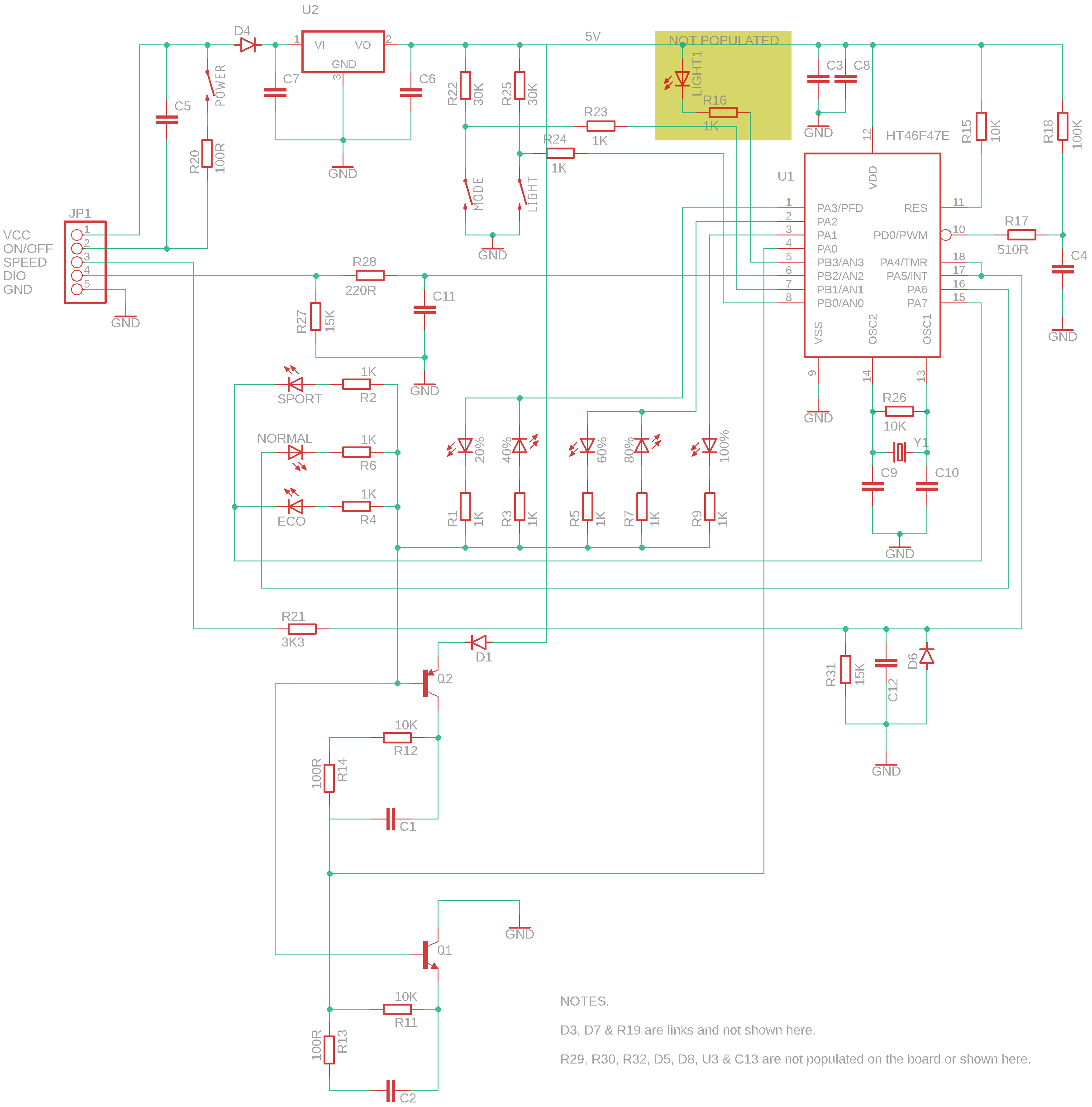 I have managed to clean up the worst of the silicone from the component side of the controller... The supply to the display is not a simple branch it looks like it is controlled by Q10, but where it comes from I have not worked out yet. (there appears to be a large unsoldered pin, just above the negative battery wire) It looks like the display power button simply sends the supply voltage to the 0/f pin of JP1 via R20.(Actually marked on/off on the controller PCB) The MCU of the display is a Holtek HT46F47E. As all the LEDs come on/go off when powered and the mode light is changing, I am assuming that it is functional.