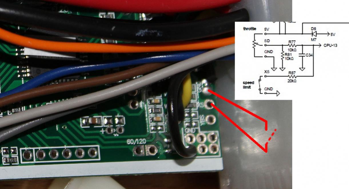 November 28, 201213 yr Author Have alook round the circuit board for a pad marked "XS". Thanks again, I've found the XS on the board, it's a vacant solder point. I'll try a switch between that and the adjacent earth point. Am I right in thinking that the 20k ohm resistor on cpu pin 13 then limits the pos voltage and therefore power to the motor ? I can't see how it would be able to regulate at 15 mph, would it just limit the output power ? If so, what do you think about the idea of just linking xs to ground and replacing R87 with a variable resistor ? [ATTACH]4523.vB[/ATTACH]