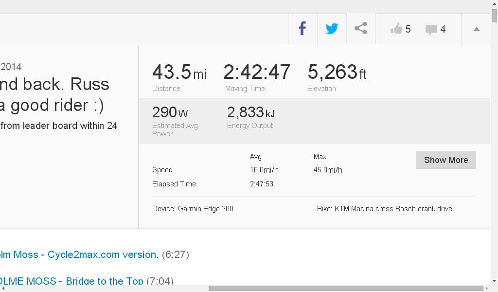 June 4, 201411 yr @[mention=2339]Artstu[/mention] 23 mph on tour is a really nice speed I'd like to be able to achieve too...I presume u have slick tires on that KTM of yours...say, what's your estimate in increase on your average speed comparing to restricted engine? Commuting being my main deal, now I average 13-14 mph according to HMI. The bike is Cube SUV Hybrid (Active engine). 23mph on tour is only on the flat with no headwind. The tyres are currently the standard schwalbe mondial tyres, they're not a very good roller IMO but they suit the mixture of riding I currently do. Hard to say how much faster I am, 2 to 8 mph. I can average 23 mph on some of my rides, that includes 800 feet of climbing too. I did a ride the other week, one way with a drop of elevation of around 500 feet and averaged just shy of 25 mph over the 14 mile journey, and about 23 mph on the return journey. Yesterday I did 43.5 miles with 5,300 ft of climbing and averaged 16 mph, most of the ride was done on tour too. Edited June 4, 201411 yr by Artstu