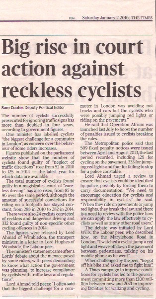 January 14, 201610 yr It seems there may be a growing anti-cyclist movement, perhaps, though not necessarily, limited to the capital. I was just about to throw out some old newspapers when I noticed this article which, though I'm sure many of you have read, I missed. On the basis that many drivers are pretty p'd off about the money being spent on cycling superhighways and various other cycling initiatives in London, causing arguably more problems than they solve and perceived by many to be to the detriment of vehicular traffic, I'm sure the beginnings of a crackdown are there to see. The unfortunate part of this for those who ride electrically-assisted machines is that if plod acquires a greater awareness than at present, (which they will), of all things bicycle-connected, then that attention drawn to cyclists generally because of the moronic element may ensnare some of those riding non-compliant ebikes/unregistered motorcycles or whatever the illegal things are called. While I have zero sympathy with those criminals who know the EAPC regulations but very deliberately choose to break them, I'm afraid any unlucky enough to face prosecution can only blame those equally criminal cyclists who choose to break other laws. Tom