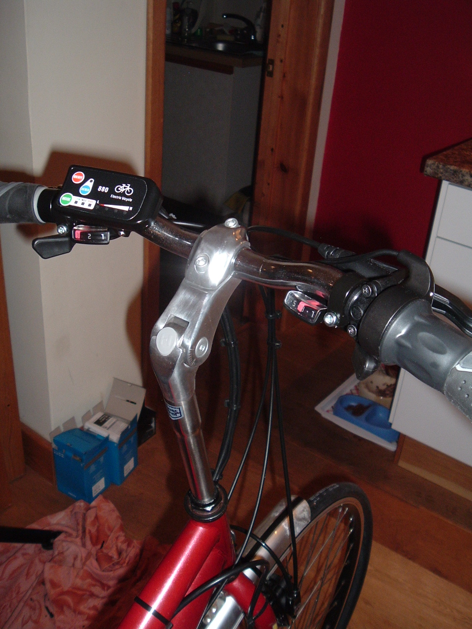 October 10, 20169 yr Author Well it's still on the workstand at the moment, mainly 'cos I forgot to order tyres:oops:. Ordered those and Anderson connectors today. Jimmy wants to sell me a 48v 21Ah battery but I've told him that my bum only has a 15Ah 36v range. The kit's on, wiring mostly in place. The Panda pas is certainly easy to fit but I'm finding it gets knocked out of line very easily and can end up coming into contact with the sensor. Although the spring clip stops it coming apart, it actually doesn't grip the shaft very well. Have to keep an eye on it. As you can see, I managed to get the Roswheel bag into the bottom of the frame without fouling the front changer. Because of the L.H. pas I've kept all three front rings, this thing should climb walls! The new quill stem is well long and brings the handlebars nicely into old fogey position. New changers are all set up and working nicely and the Magura is ready to go. The motor has two tabbed washers, on it's shaft, which fit nicely into the bottom of the dropouts. Not sure if I need a torque arm or not. What do you think? So waiting for tyres and battery. You may notice that I have the poshest workshop ever, with oak floor, fridge and oil lamp. Trouble is, she who must says she wants it for cookin' an' fings. Really, there's just no stopping the liberated woman is there:D;)