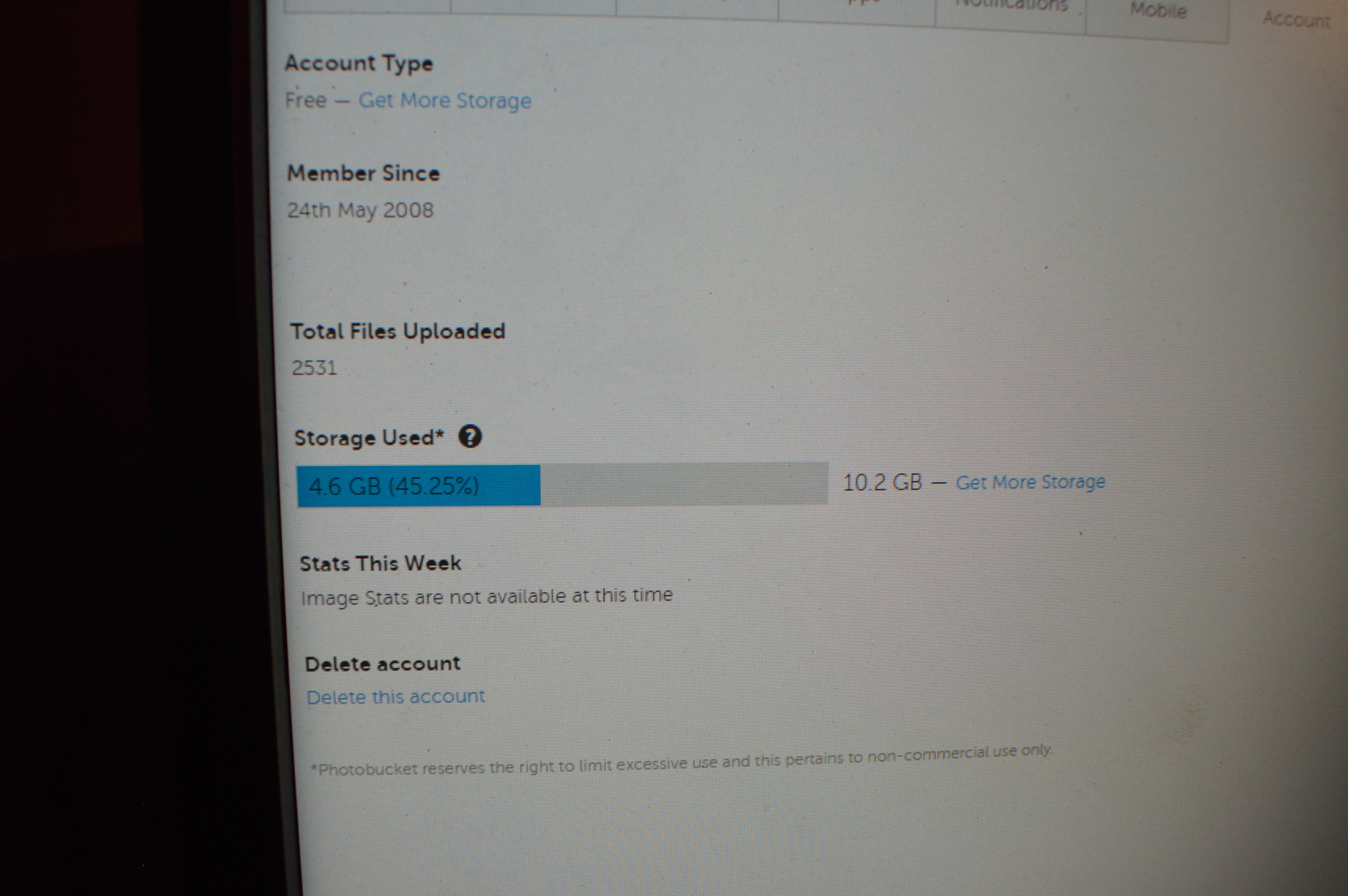 July 3, 20178 yr Latest terms and conditions: Types of Accounts, Pricing and Limits Visiting : There is no cost to visit the Site or to register as a Member. Free account : Each individual Member gets one free account that provides 2 GB of free storage or space available for your original photo files, or videos under 10min. The free account does not allow any image linking or 3rd party image hosting. If a free account Member exceeds their Content Limit, their account will be immediately suspended and they will need to become a “Paying Member” (defined below) in order to continue accessing their account. You can upgrade to a Plus account at any time. Ad-free Account : The Ad-free Account offers Members the ability to use the Site without seeing any third party banner advertisements when logged into your Ad-free Account (note, viewers of your images within Photobucket will see ads unless they, too, have Plus accounts and you will continue to see Photobucket offers and announcements). This account level is available for $2.49 / month, payable by the Member on a monthly recurring basis. Read more: http://photobucket.com/terms#ixzz4loUvDg5D