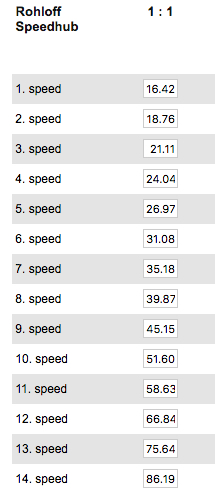 Scroll down to the Rohloff results at the bottom, Column 1:1 (ignore the other columns as they relate to other gear systems)