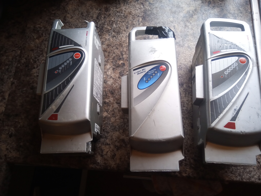 These are the lighter 10AH batteries. They are at least 6 years old but still work ok. The lights based capacity meter is 4 out of 5 for two, so they've lost 20% of their capacity. The other is 3 out of 5 so it has lost 40% of its capacity. One of the batteries has been dropped at some point and has lost its handle and two of the four screws have been damaged. I've fixed it with tape and it holds together fine. Another has a small crack on the handle so i've added some tape to that one to prevent further damage. The other is structurally undamaged. Price is £120 plus postage for all three batteries. . I'm also going to put them on ebay but they'll be cheaper if you buy directly from me from this forum.
