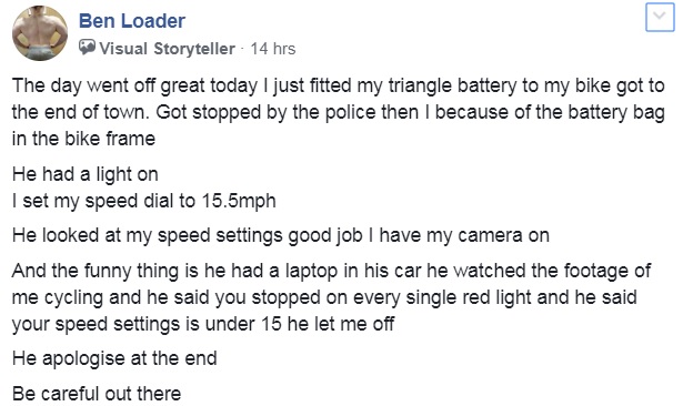 It's a fair cop, when the cop's fair. :) It sounds like he's playing the game by riding safely and the police seemed content with that.. and a free ebike ride around sunny Bristol. :D
