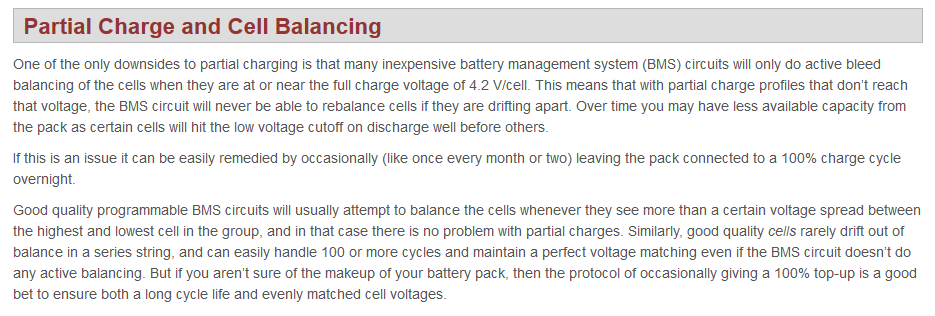 October 7, 20205 yr Author All very interesting. So might there be a fairly safe regime using a programmable charger to limit the cut off to whatever voles, with an ordinary battery. There was a comment that BMS only needed after 100 charges. So play safe and do BMS one in 20 or something. It would extend the life by some amount. It seems to be the case that if you have a good quality pack, you could get away with a balance charge once every 100 cycles. To be safe it's probably best to do a balance charge once a month. Some BMS units have a Bluetooth connected app which allows you to look at all the individual bank voltages without opening up the pack. Definitely worth considering if you are building your own pack.