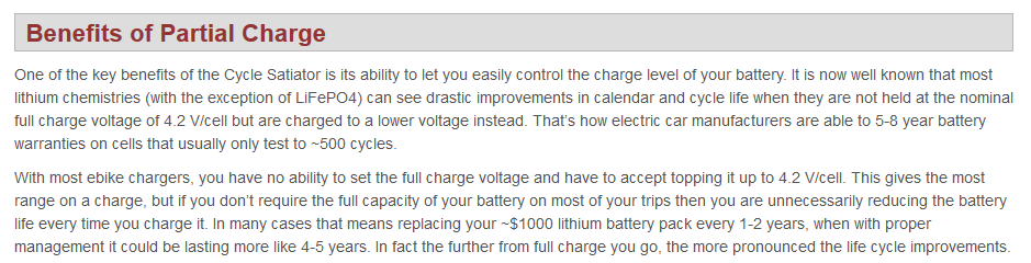 July 19, 20205 yr The guy's on ES are pretty adamant that lowering top charge ekes out the cycle life and capacity, I came across this charger recently, which I thought interesting: They call it a "cycle-life charger" as it's already supplied with a fixed voltage of 41.3v (3A current). https://enerprof.de/en/chargers/ebike-battery-chargers/42v-chargers-for-36v-batteries/727/fuyuang-cycle-life-charger-41.3v-3a-for-36v-batteries-li-ion?c=108
