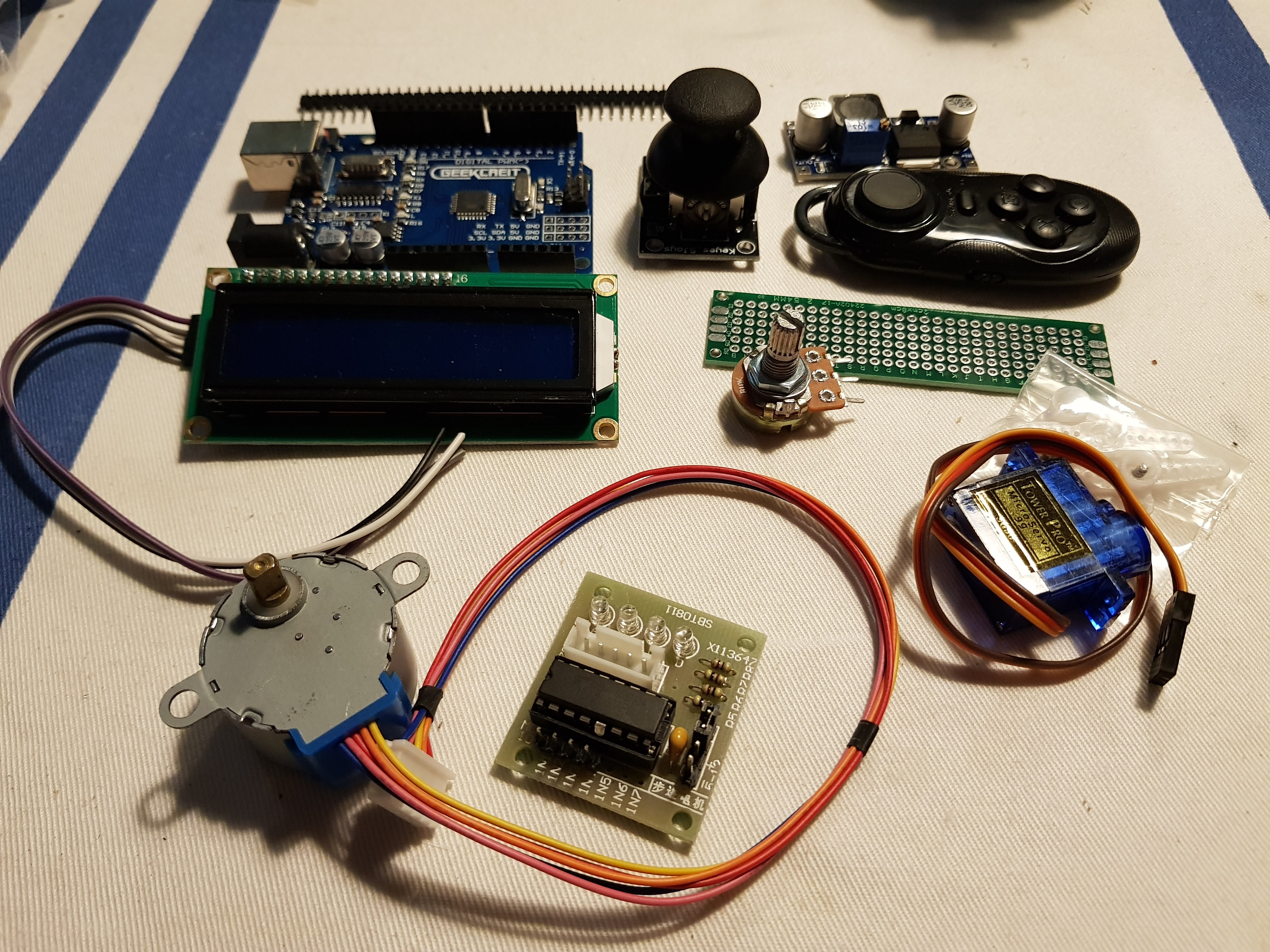 October 8, 20232 yr Apart from the Arduino Uno, the buck converter and BT gamepad I had rest of this in a Sunfounder kit I bought years ago. You can see the gamepad in top left in it's 3D printed housing to be screwed down inside the turntable, what happens is the servo activates and moves the flipper that hits a specific button on gamepad that is bluetooth connected to phone and configured to take one pic per button click on phone. Video whilst testing here: Pot is for LCD 2*32 display brightness