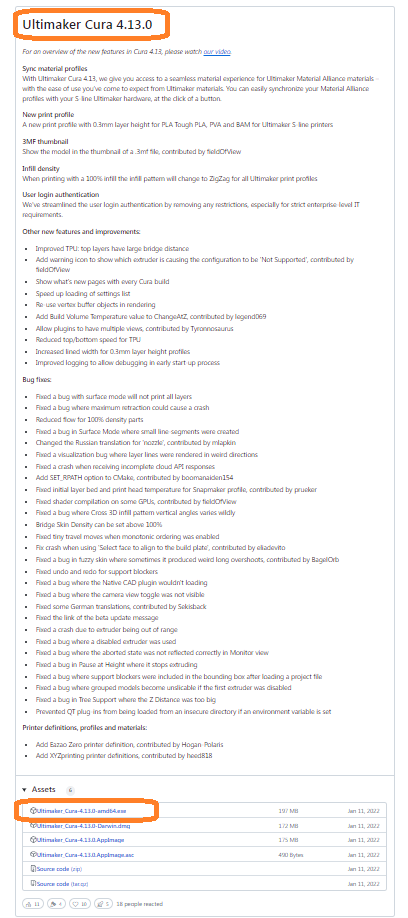 October 25, 20232 yr I did try looking for Cura 4.x but the best I came up with was a github repository which tbh didn't seem to have any executables in it. I'm a bit of a numpty where github is concerned - I like fully packaged installations, double click and all that, lol. Cura 4.13.1: https://github.com/Ultimaker/Cura/releases?page=2 Expand the [Assets] tab to see the .exe Windows installer - install this. I just upgraded from 4.10.0 to 4.13.1 on Win7 Mackbook Pro until I have some time to mess on my Win10 workstation to get 5.x working.