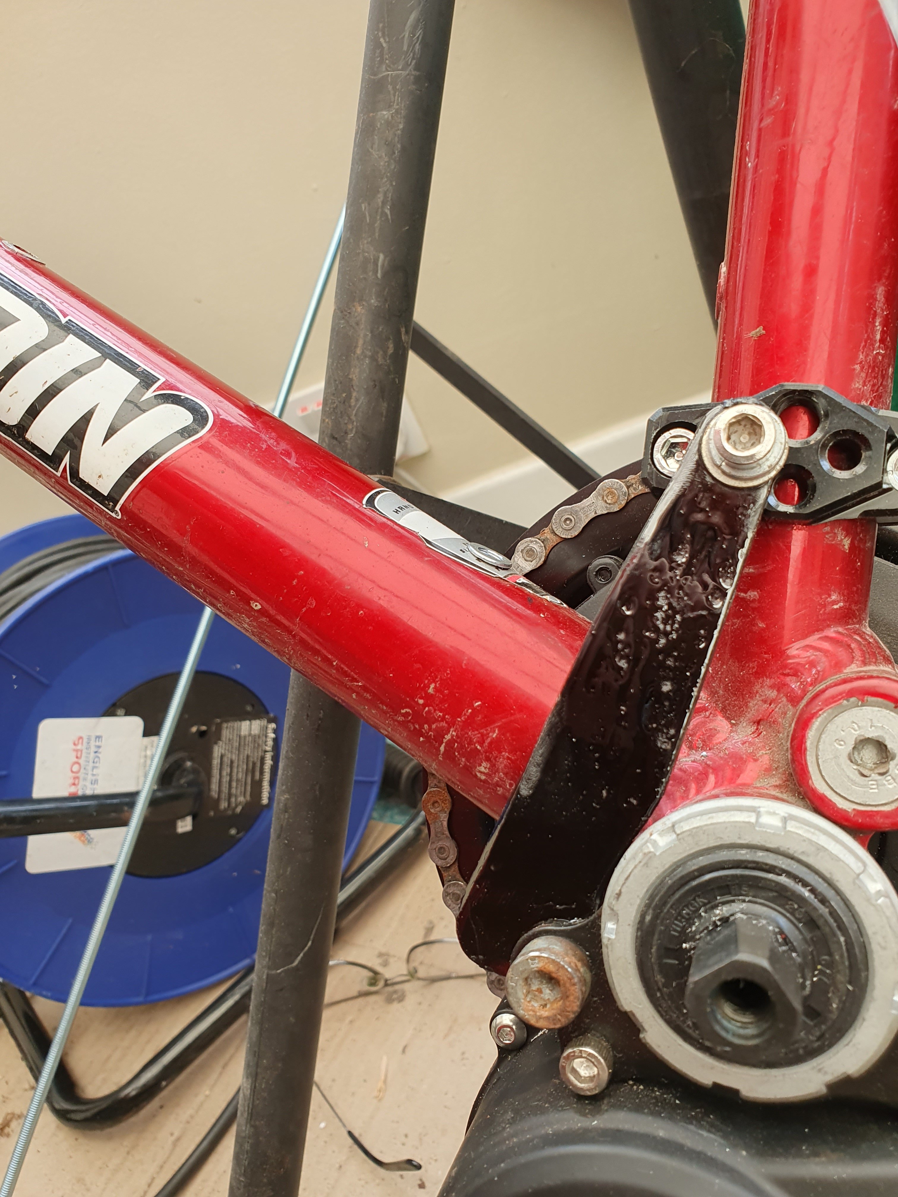May 14, 20241 yr Author Finally some progress. Other things have been getting in the way. The main obstacle has been the problem of how to deal with the torque reaction from the motor on a full-suspension bike, so here's how I did it, which can easily be copied by any of you lot. All you need is some 2.5mm steel plate/strip of any metal that has similar stiffness, then a drill and a file/angle grinder to shape it. There isn't quite a straight line from the fixing point on the motor's anti-rotation plate, so you need to file or grind a slight scallop in one edge. The main problem was to find a secure anchor point for it. I wasn't happy that a normal P-bracket would be secure enough, nor a plastic printed part to be strong enough. Then I found these, which were perfect. I can use the back 6mm fixing point to hold a bracket for the musguard. It's OK as it is, but a bracket would be better: https://www.ebay.co.uk/itm/355288298436 Here is the torque arm now fitted: The clearance between the motor and the swinging chainstay is very tight. The lug for the screw interfered at first, but I managed to get just enough rotation to clear it: