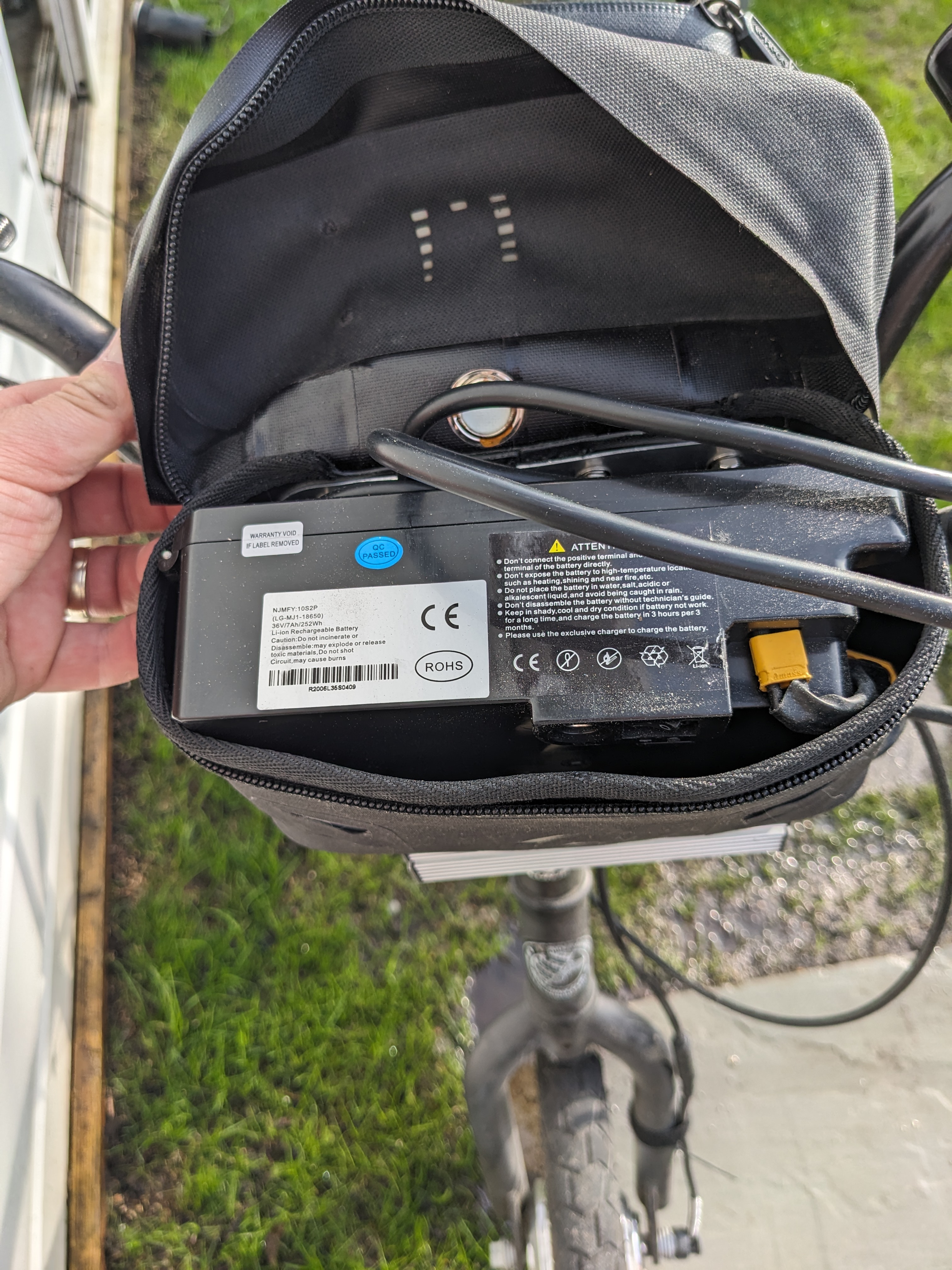 May 11, 20241 yr Here are some pictures of my bike. [ATTACH type=full" alt="57668]57668[/ATTACH][ATTACH type=full" alt="57669]57669[/ATTACH][ATTACH type=full" alt="57670]57670[/ATTACH][ATTACH type=full" alt="57671]57671[/ATTACH] The bag is too high to hold a heavy weight. You should get a downtube battery, put some rivnuts in the crossbar and mount it there, or make a rack for it and fit a battery there. Either of those two methods will make your bike handle a lot better.