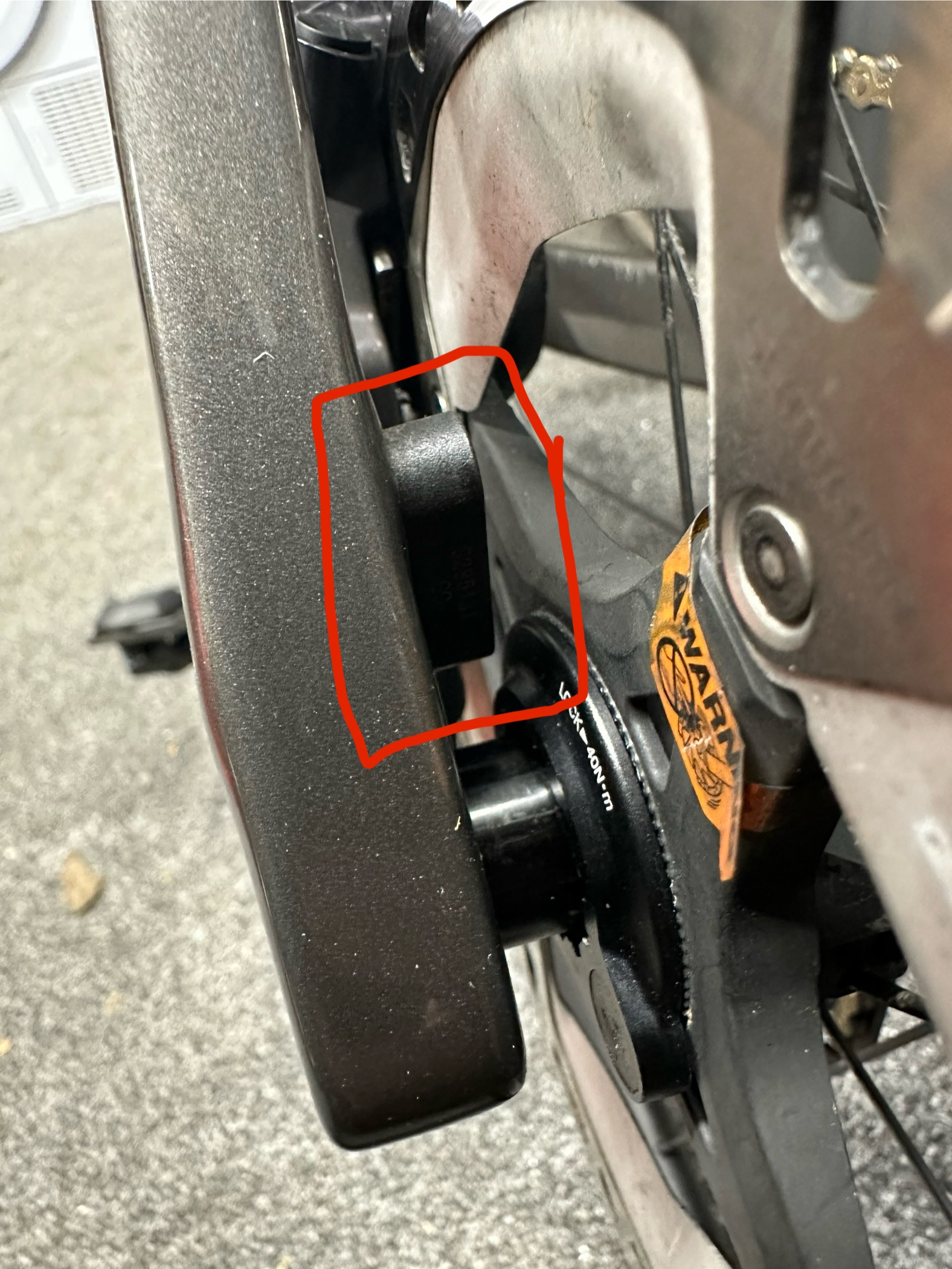 December 29, 20241 yr Author Sure thing. Picture of bike sensor: in red box is the area where the magnet passes and registers for speed. Picture of trainer: purple cross shows where the magnet should be, but there’s nothing rotating I can use so that’s a no go. The Red Cross shows where I could attach a magnet, but current sensor on bike won’t pick it up, too high and too far away. So I need something to read the signal from the Red Cross, and relay it to the sensor which is nearer the purple cross!