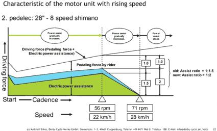 June 6, 201114 yr This confirms that power profile for the ramp down has been changed from the 2009 versions of the Agattu as is now much more as shown in the April 2011 edition of the Kalkhoff manual, here: [ATTACH=CONFIG]2312[/ATTACH] It confirms my suspicions that the peak output is just under 14 mph rather than around 10 mph which my handbook shows for the old model. No wonder I am finding the bike so good at higher speeds! I had learned of the change a little while ago and tentatively altered some details at the start of the article in my Pansonic website on how these units work, though it needs further amendment now. The change seems to have probably coincided with the altered chainring and rear sprocket, the chainring now 35 tooth from 41 tooth with the cadences different now. The alterations eliminating the influence of Japanese e-bike law seem to have been designed to suit the export markets better.