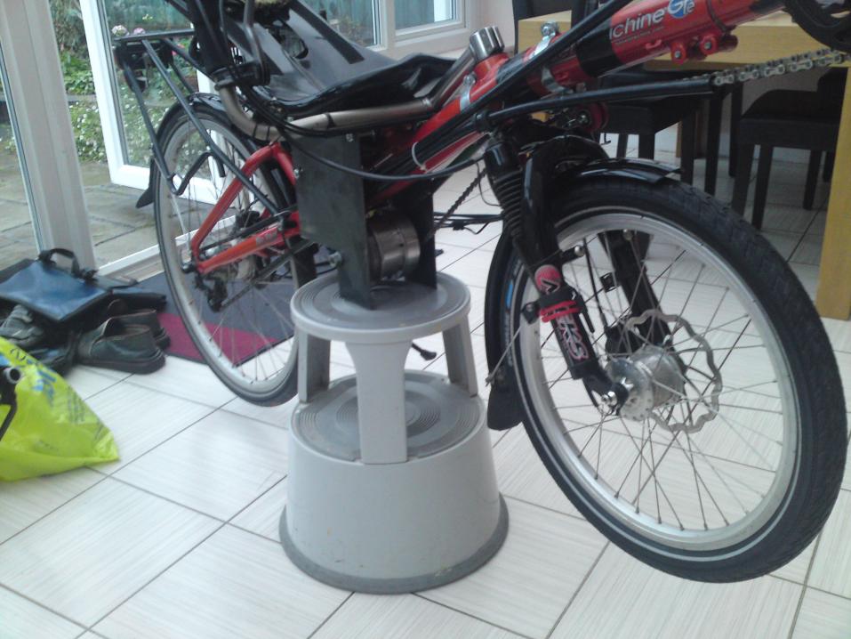 October 27, 201114 yr Author This is interesting ... because I have "fork plates" with a particular very basic shape (I was thinking about making it lighter and more sexy ...cutting bits away , drilling holes, etc ... ) I can use it to balance on a office stool: [ATTACH]2843.vB[/ATTACH] Now.. if I add some telescopic legs I have a travelling bike stand which would be brilliant. when I had THAT puncture I had to lay the bike down on its side to do the repair ...