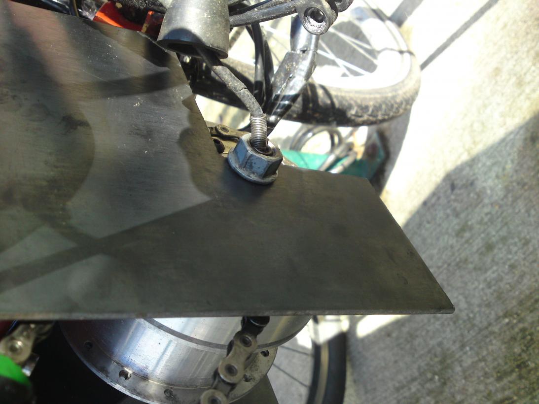 October 28, 201114 yr Author Concentrated on the gearing last night and moved the chain to the smaller chainring. 48T to 36T. Had to remove some more links and improve the arms of my chainwheels and move the motor slightly to avoid some chain rubbing ... and then a midnight test ride around Alton including a hill this time! ... was noticably better. Much improved torgue and motor performance. This morning I sat looking at the bike with its bent handlebar, supped some tea and pondered and then snapped out of it and decided to try again! ... So glad I did, had an excellent cycle to work. No messing about this time. No cameras. No photos ... well, except this one which emphasizes my need to make use of things .. in this case a disguarded bit of plastic from a Ultra Motor Fast4ward ... [ATTACH]2847.vB[/ATTACH] Here is a photo of the new chainwheel config: [ATTACH]2849.vB[/ATTACH] Edited October 28, 201114 yr by kitchenman